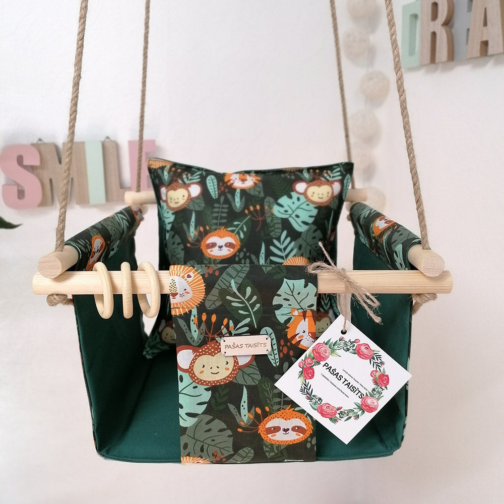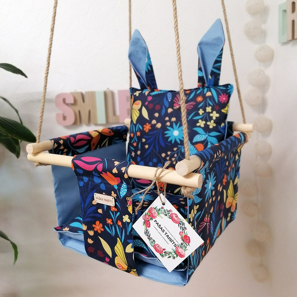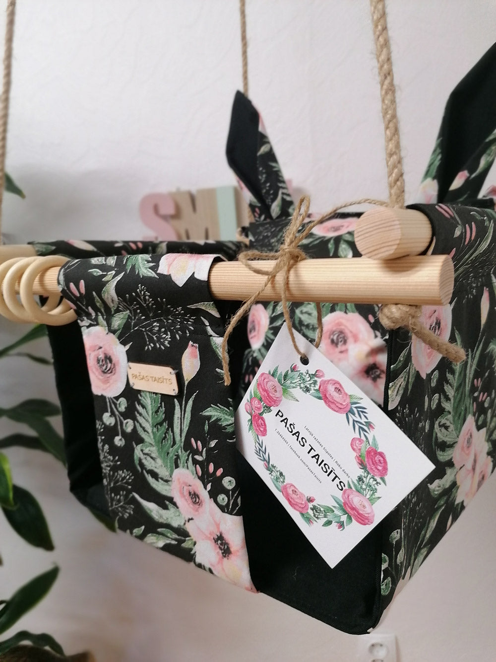 Lietošanas instrukcija – Paredzētas līdz 25 kg. Neatstāt bērnu vienu, nepieskatītu šūpolēs! Pārliecinieties, ka stiprinājums ir drošs un ir aizskrūvēta karabīne. Mazgāt 30grādu temperatrā, iesakām ar rokām. Var lietot iekštelpās un ārā. Neatstāt ārā lietus laikā! Neatstāt saulē, lai neizbalē krāsas.