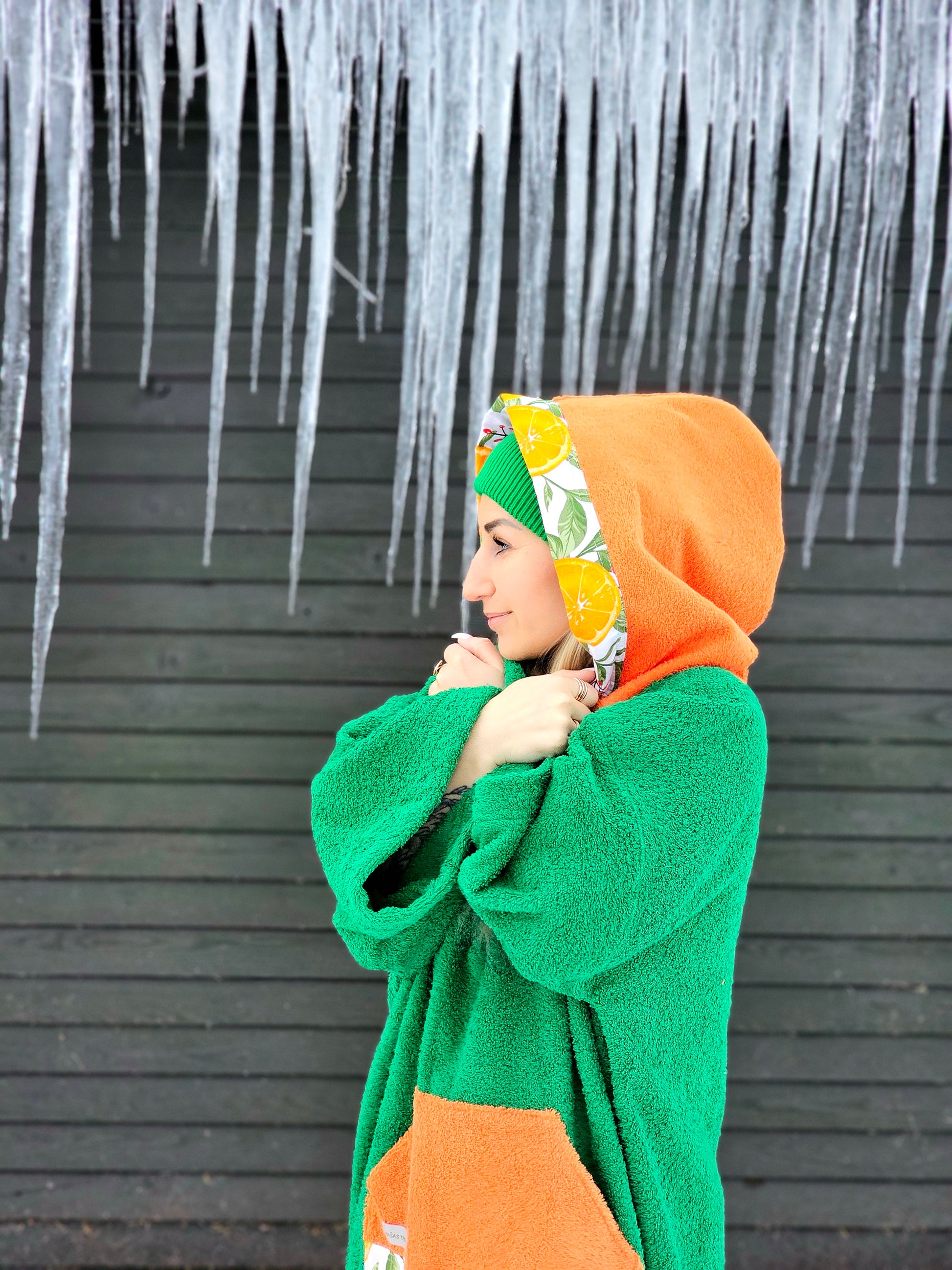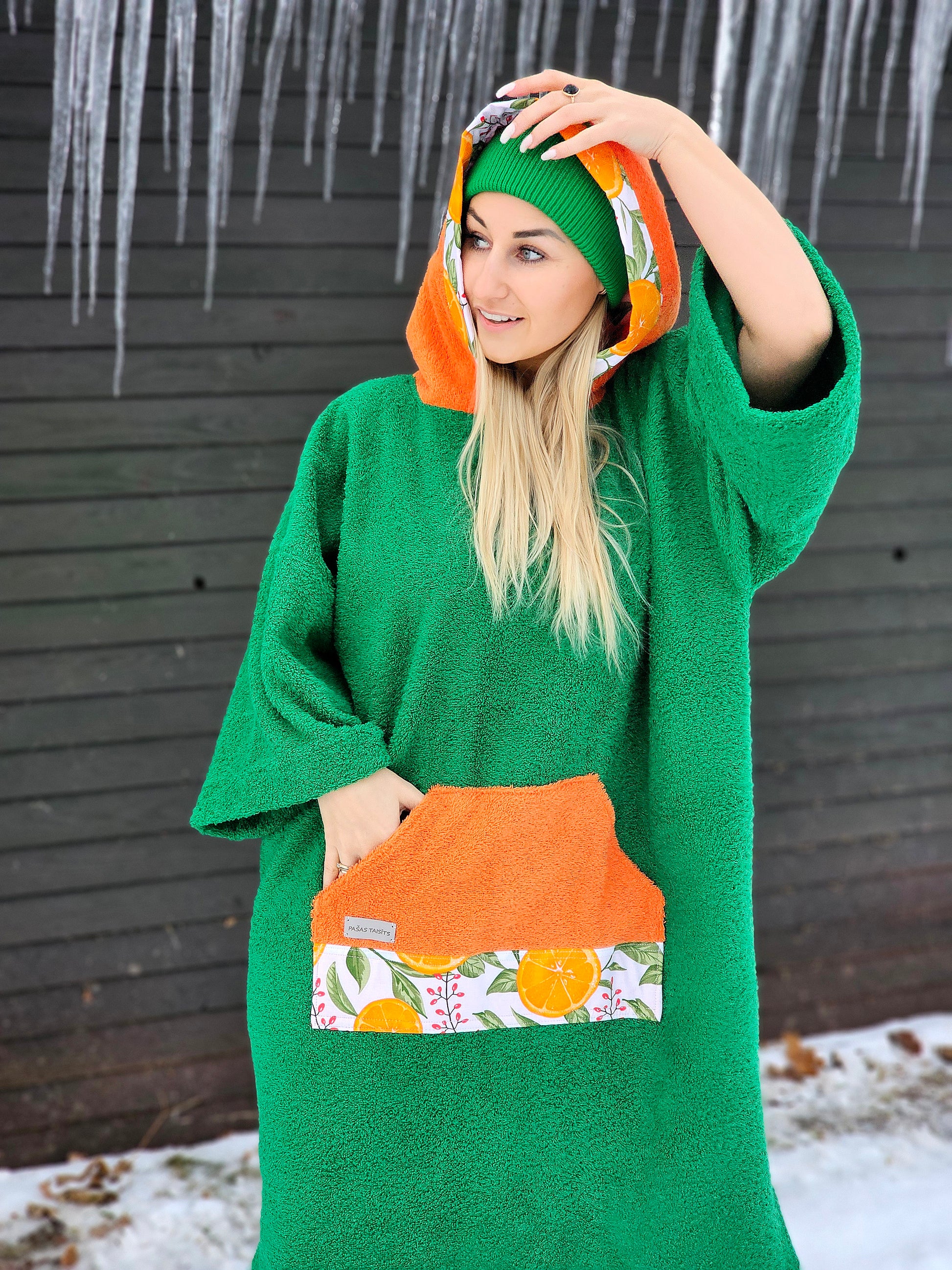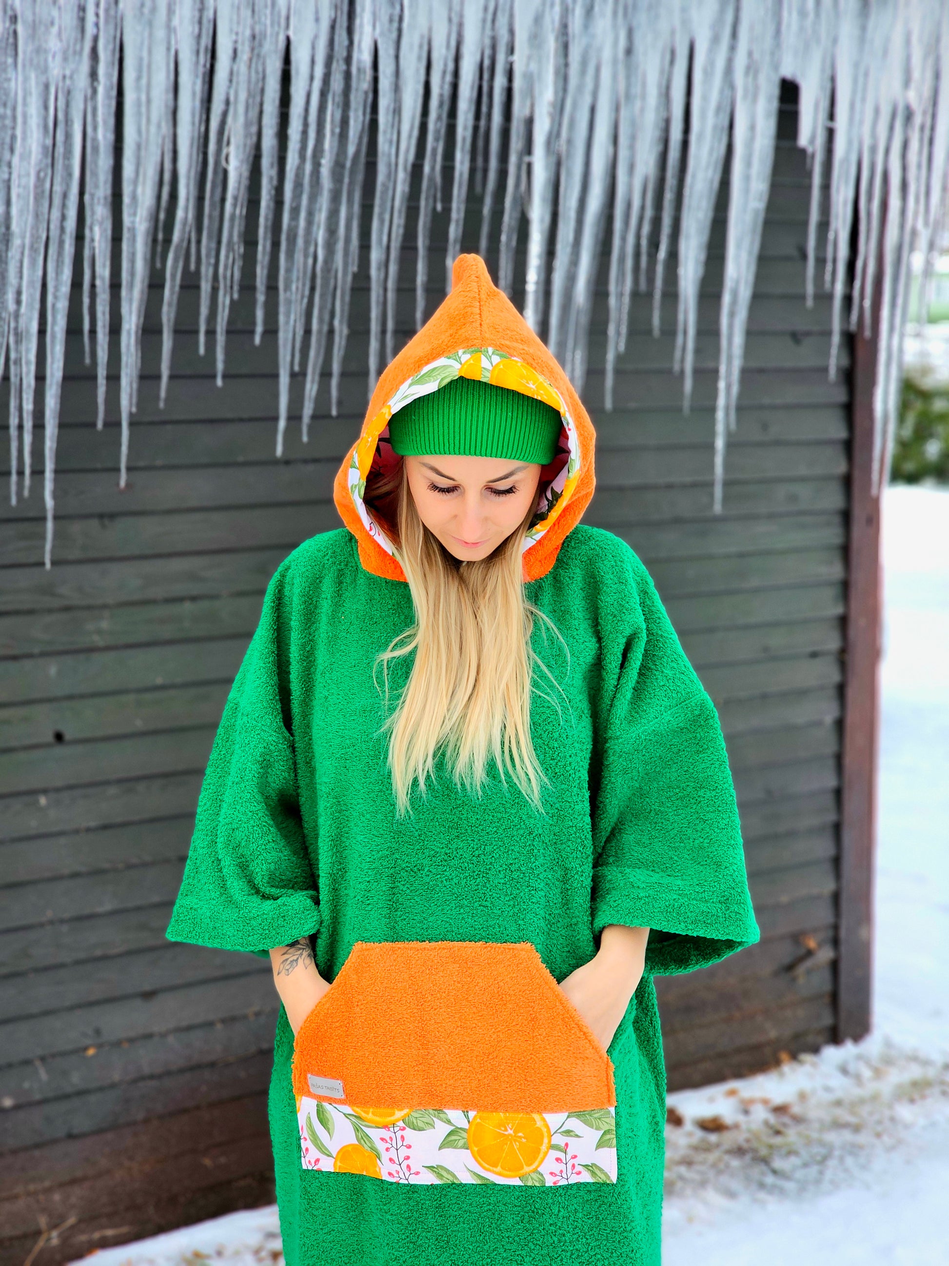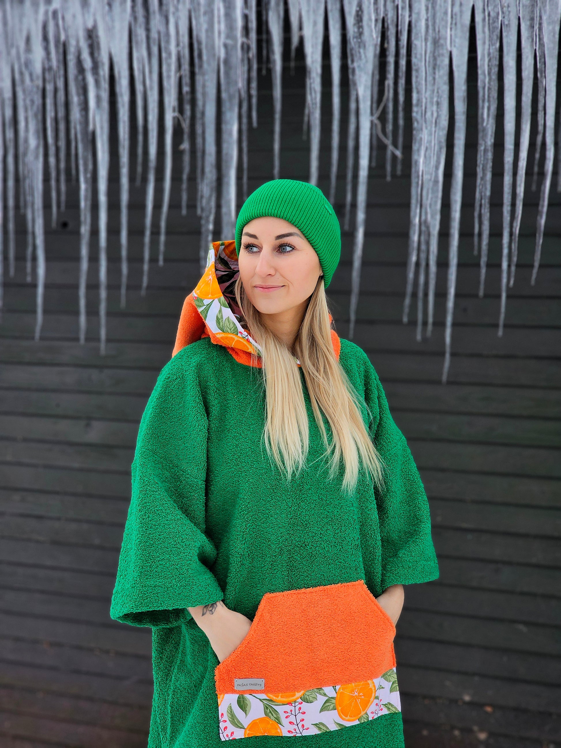Pončo tapa, jo mēs paši esam lieli pirts un kubla cienītāji un baudītāji. Īpaši, kad pēc pirts jāskrien uz dīķi atveldzēties un pēc tam gribās pasēdēt ārā, lai izbaudītu šo burvīgo sajūtu. Halātiņā ir silti, vējš netiek klāt un tas lieliski uzsūc mitrumu. Noteikti derēs arī tiem, kuri ir iecienījuši doties aukstajās peldēs vai “roņot”.