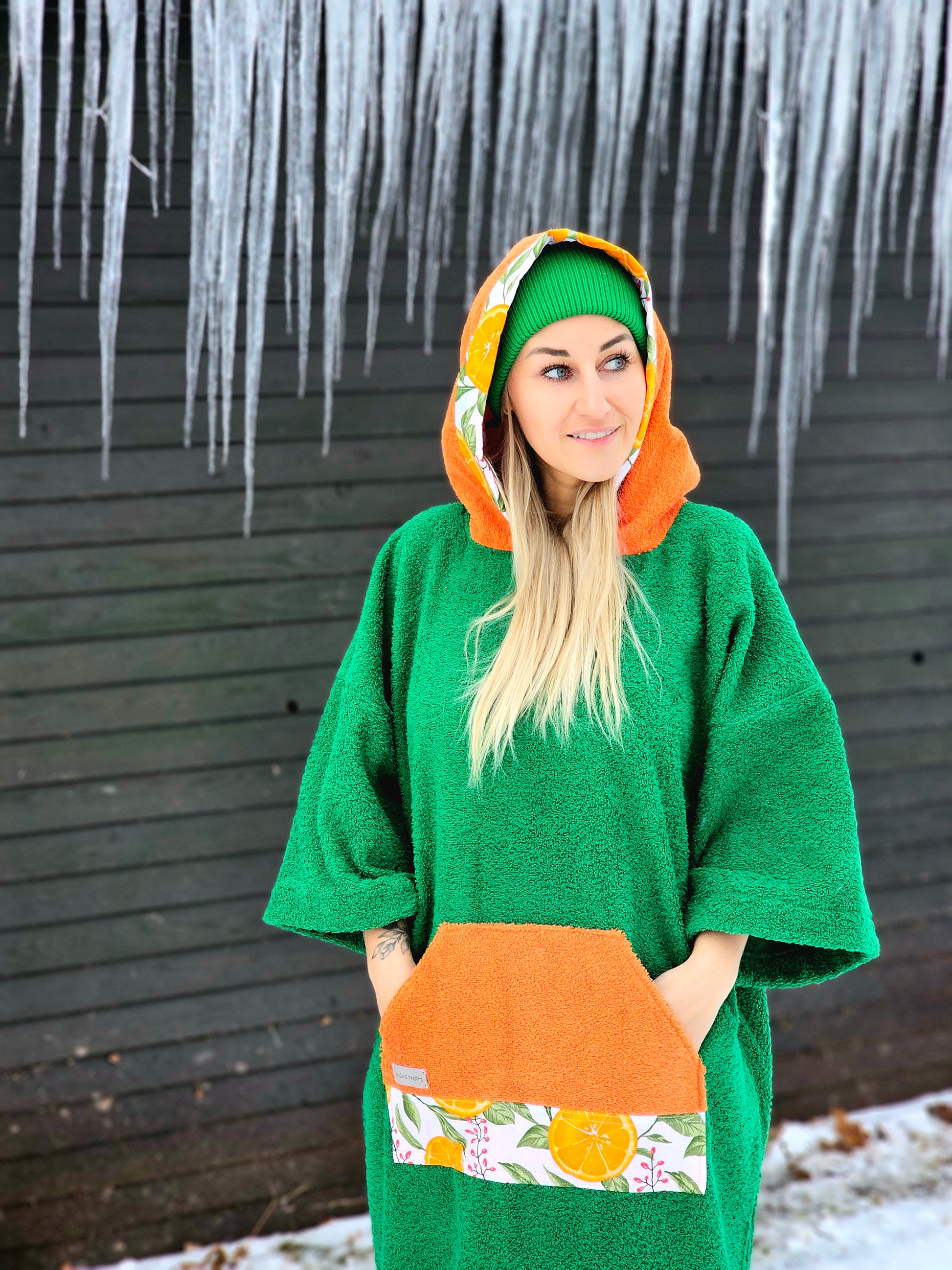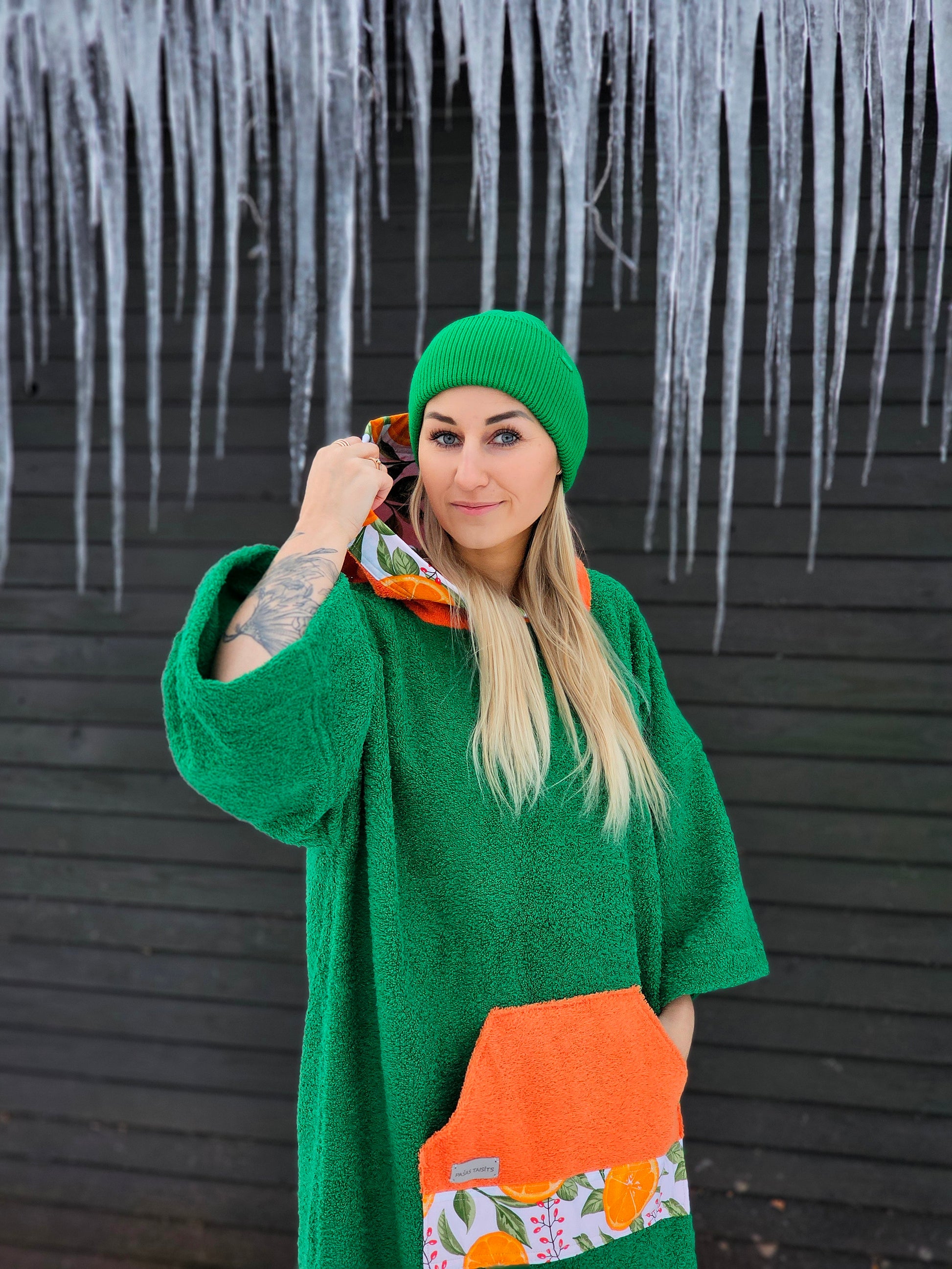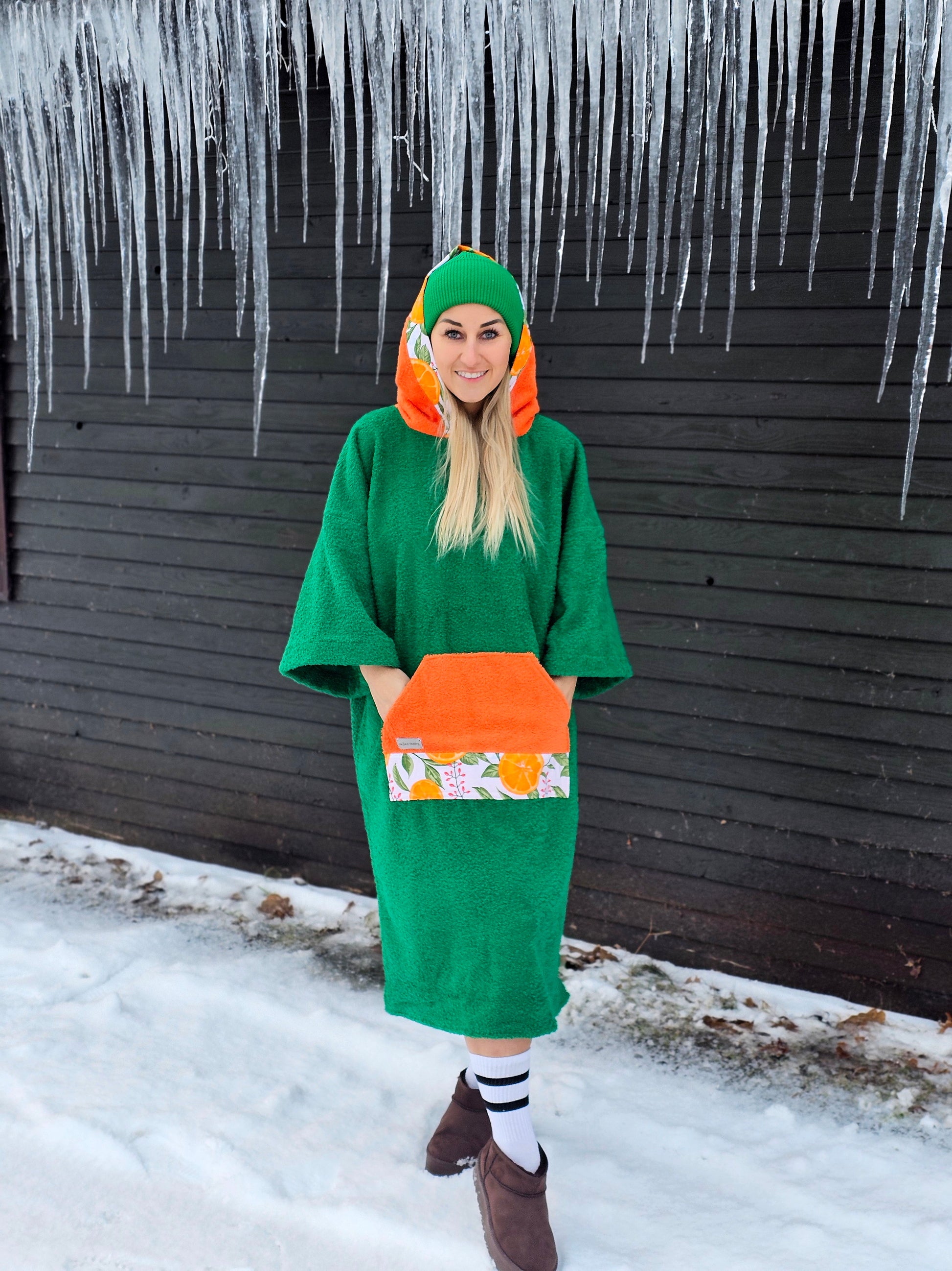 Pončo tapa, jo mēs paši esam lieli pirts un kubla cienītāji un baudītāji. Īpaši, kad pēc pirts jāskrien uz dīķi atveldzēties un pēc tam gribās pasēdēt ārā, lai izbaudītu šo burvīgo sajūtu. Halātiņā ir silti, vējš netiek klāt un tas lieliski uzsūc mitrumu. Noteikti derēs arī tiem, kuri ir iecienījuši doties aukstajās peldēs vai “roņot”.