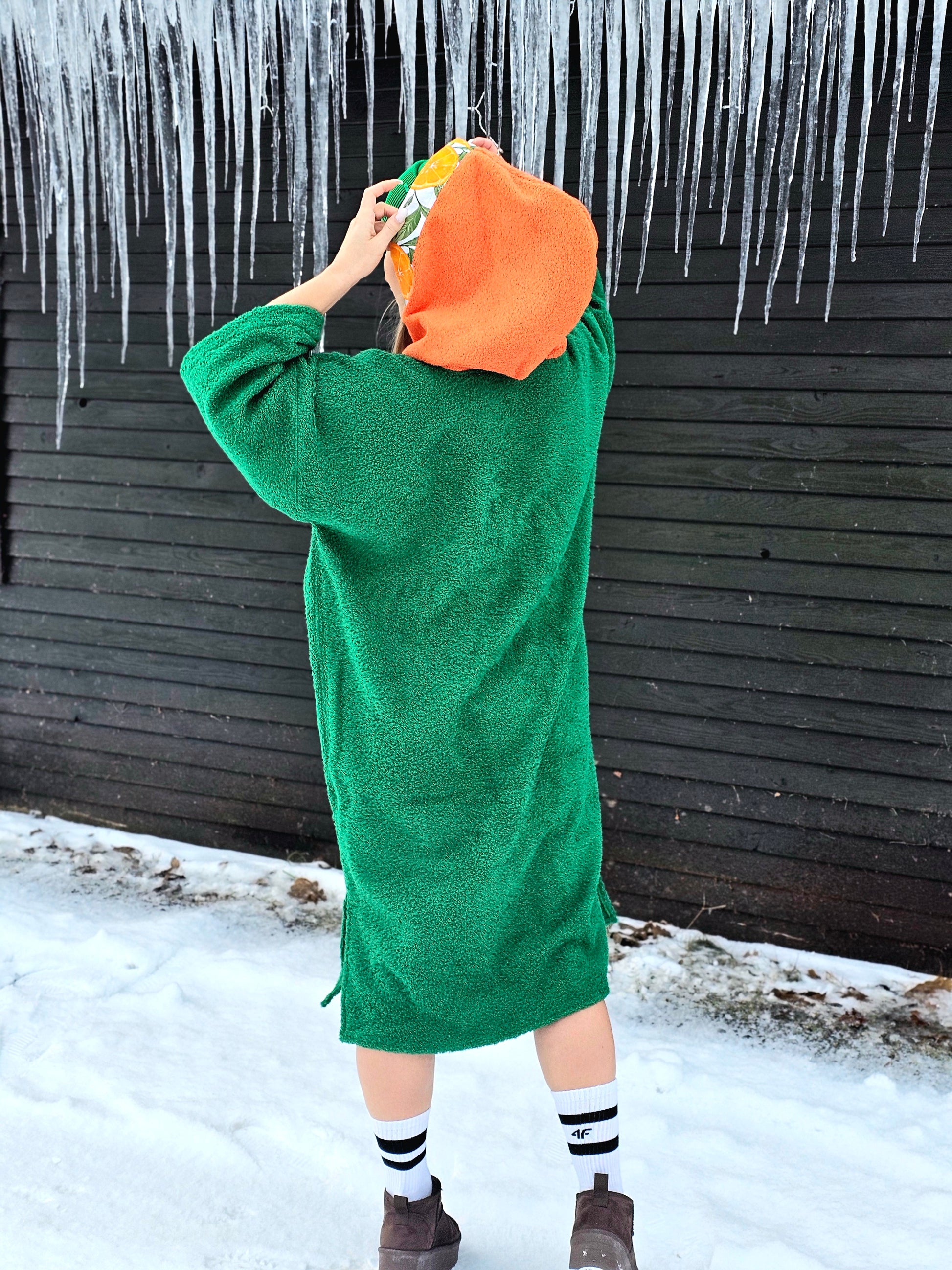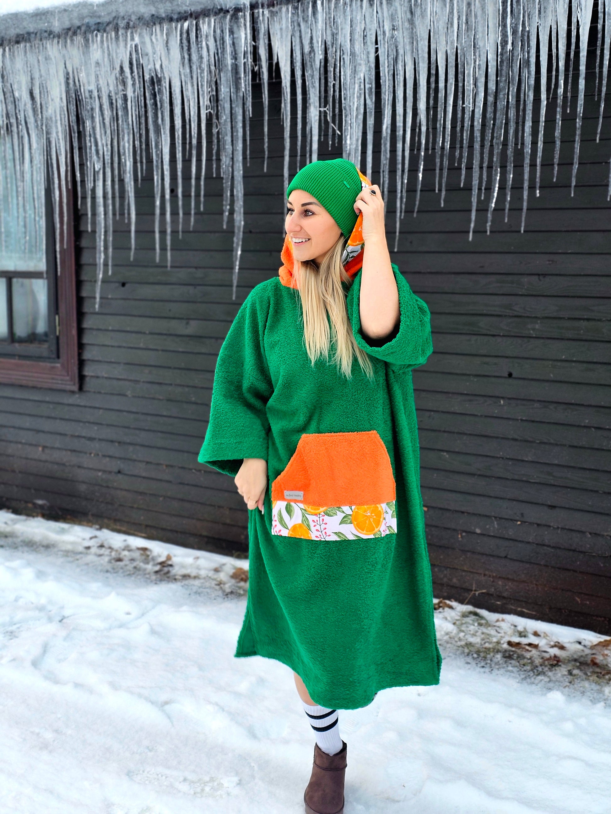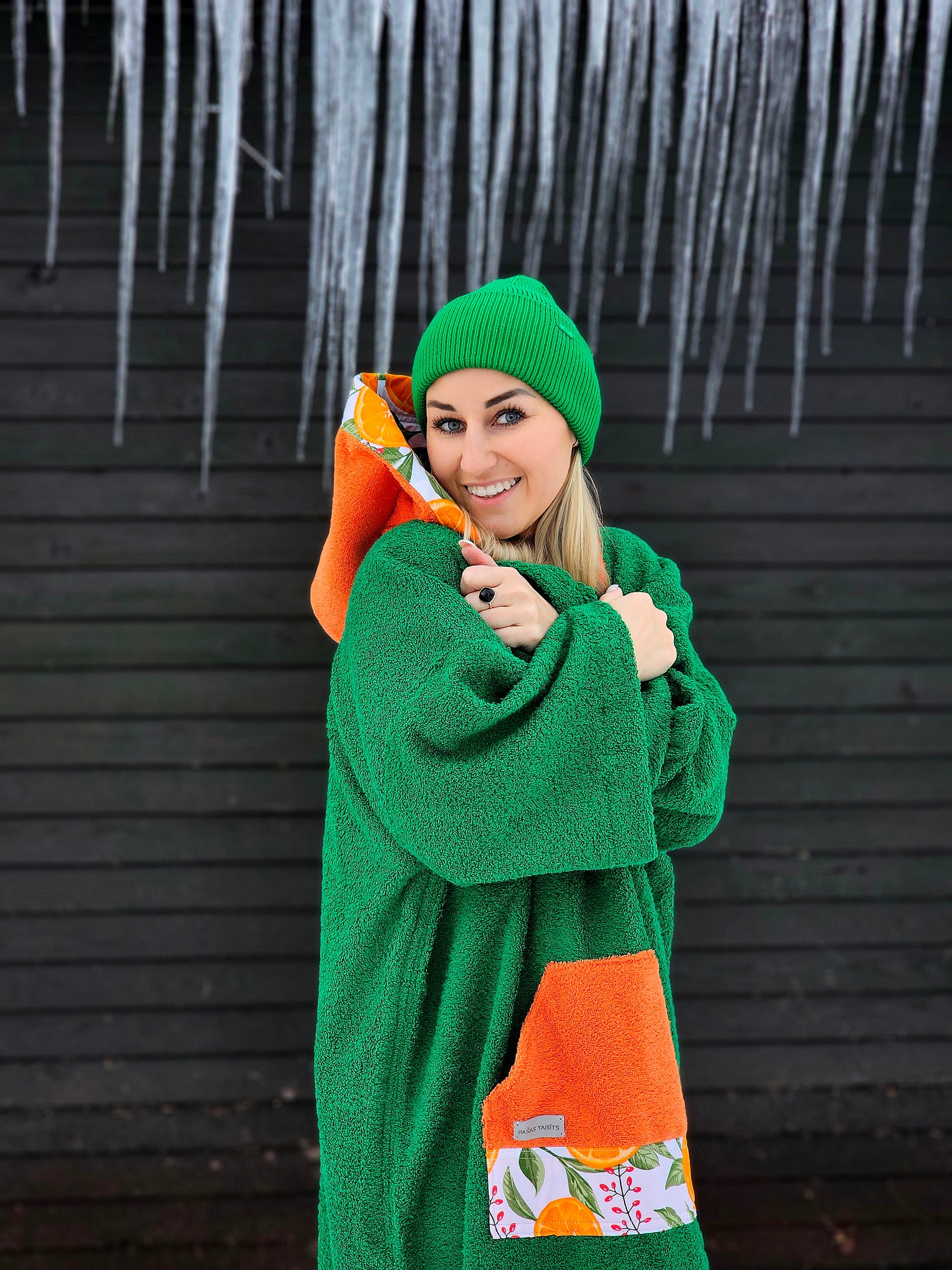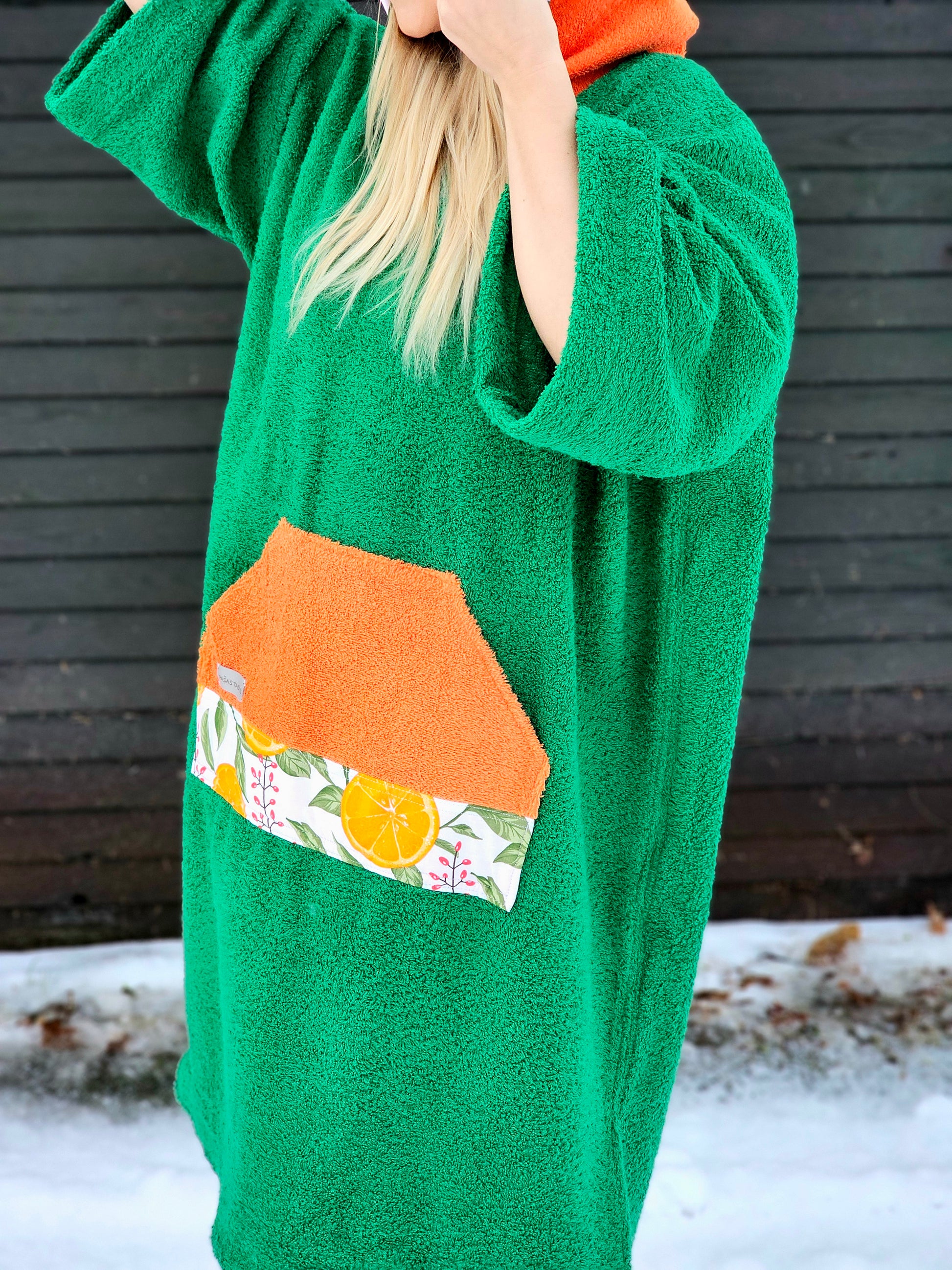 Pončo tapa, jo mēs paši esam lieli pirts un kubla cienītāji un baudītāji. Īpaši, kad pēc pirts jāskrien uz dīķi atveldzēties un pēc tam gribās pasēdēt ārā, lai izbaudītu šo burvīgo sajūtu. Halātiņā ir silti, vējš netiek klāt un tas lieliski uzsūc mitrumu. Noteikti derēs arī tiem, kuri ir iecienījuši doties aukstajās peldēs vai “roņot”.