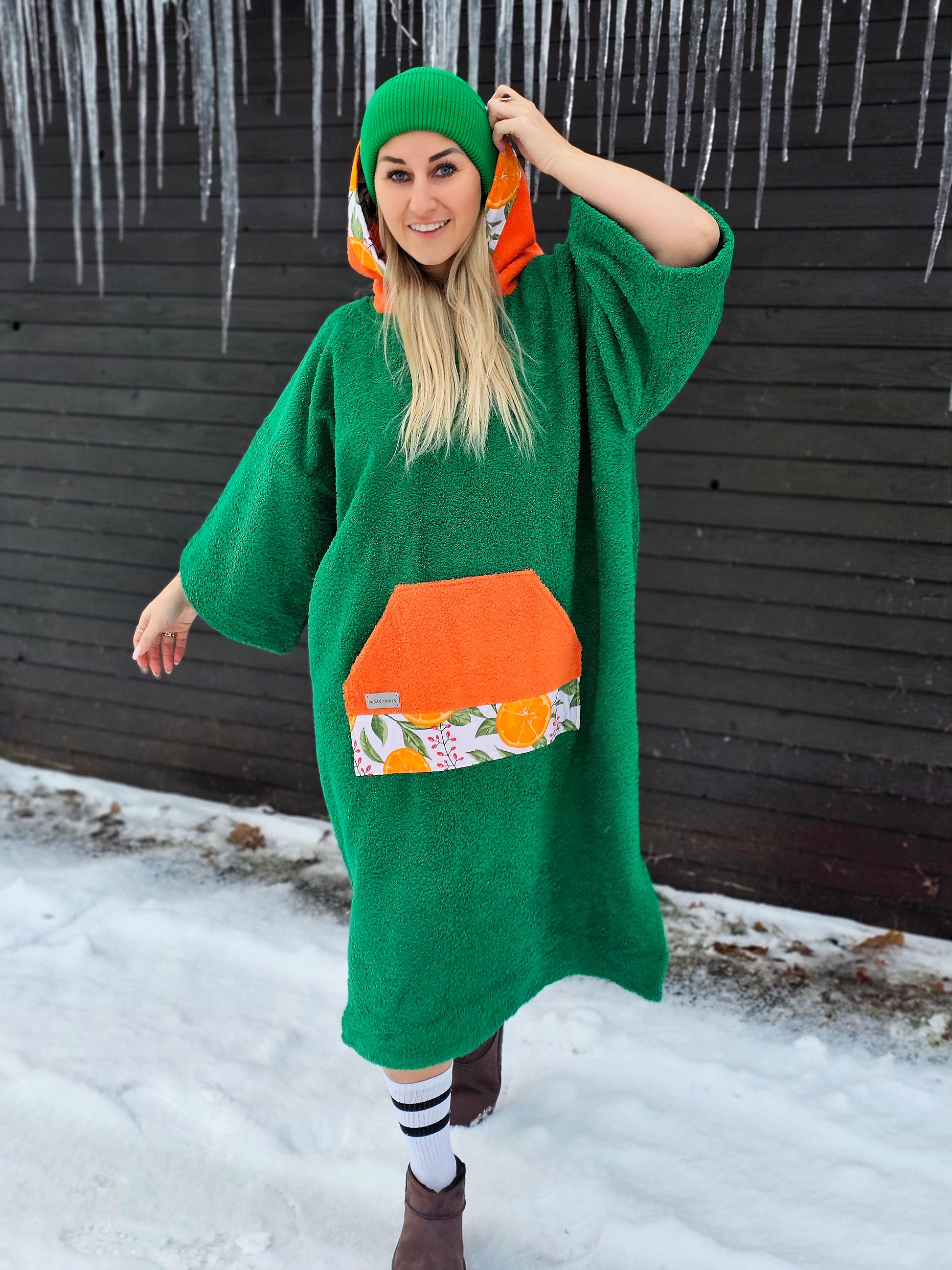 Pončo ar lielu kapuci, 1 kabatu priekšā un pagarinātām piedurknēm. Aizmugurē ir cilpiņa, lai var ērti pakārt.