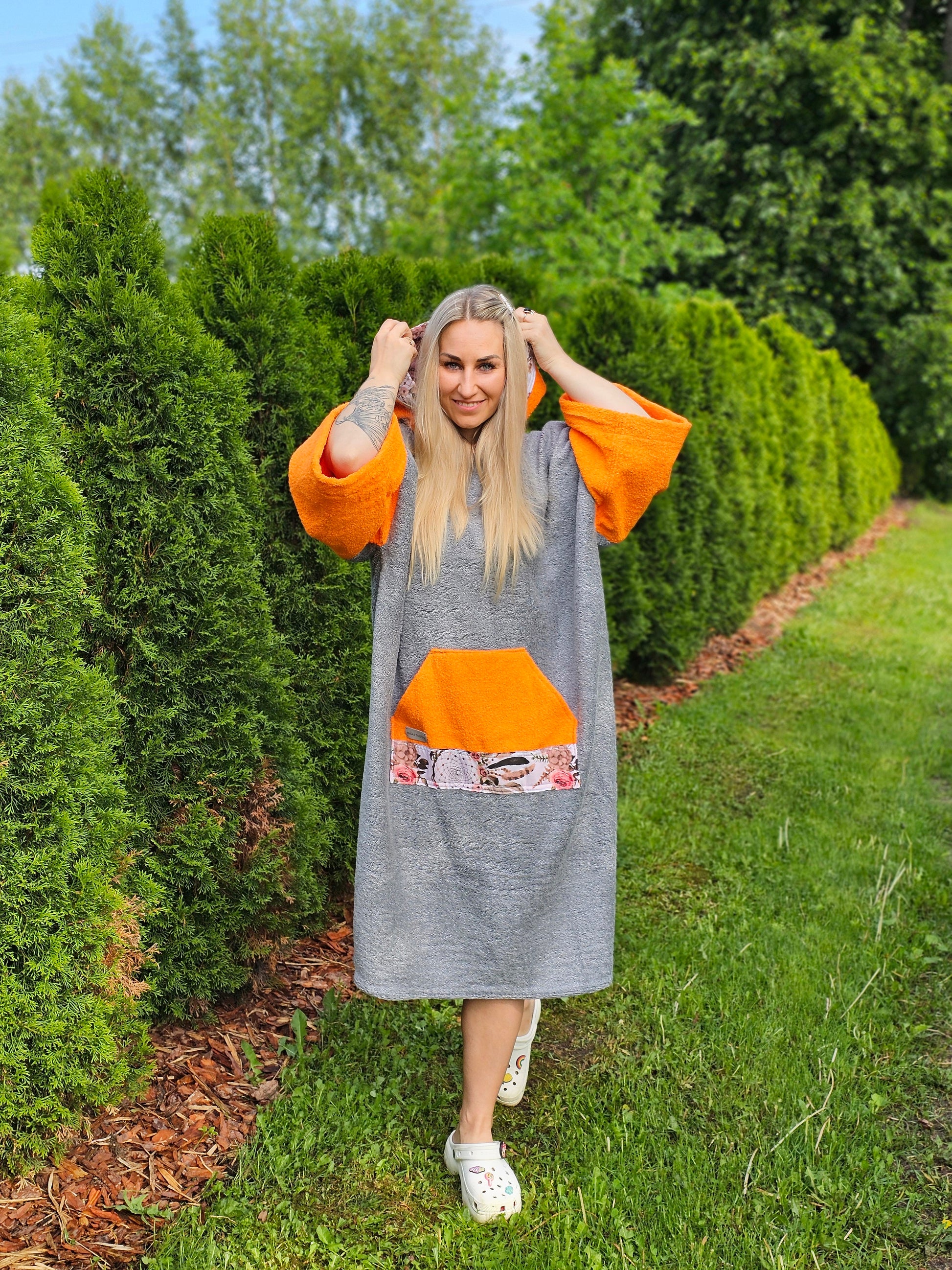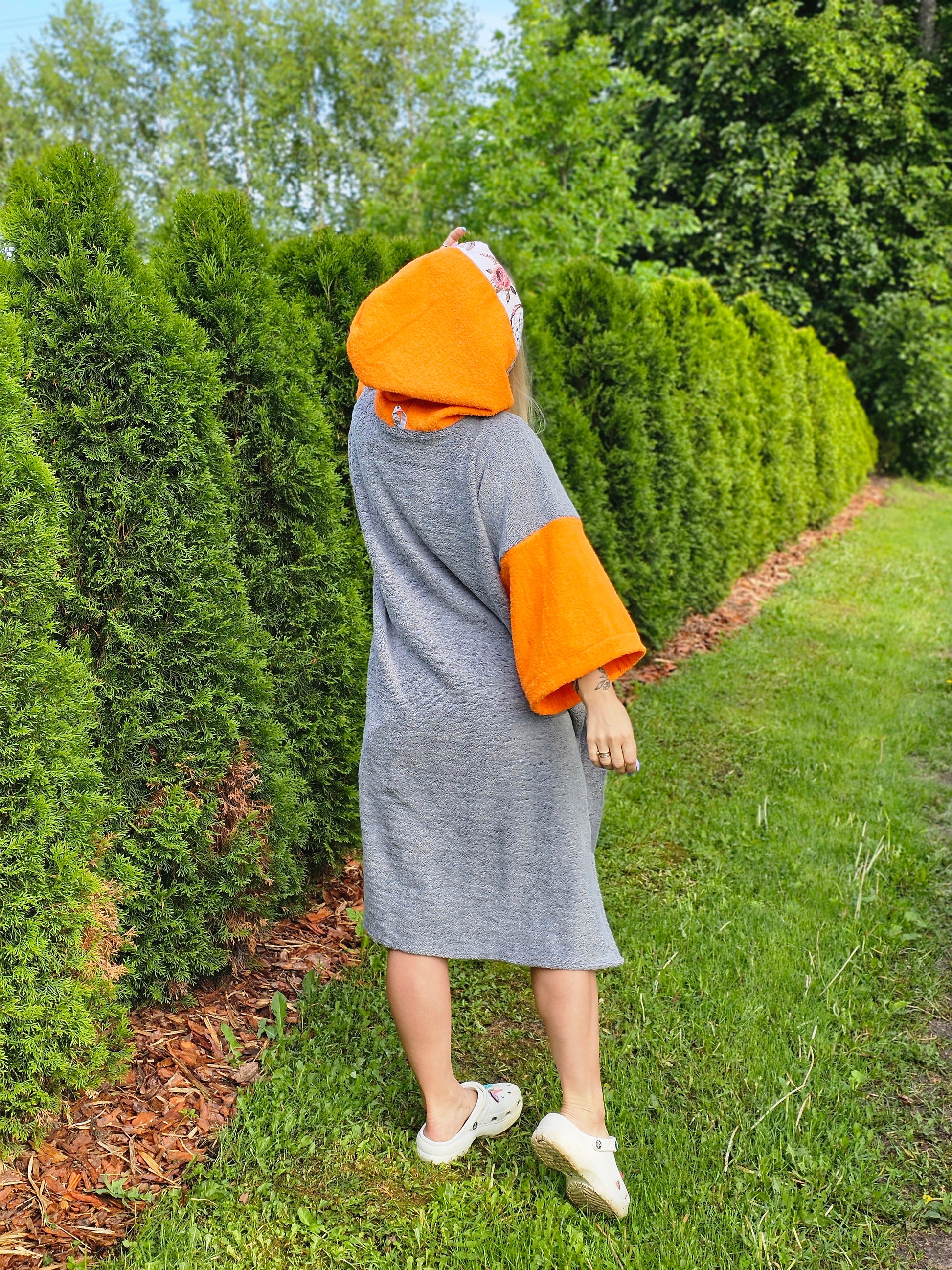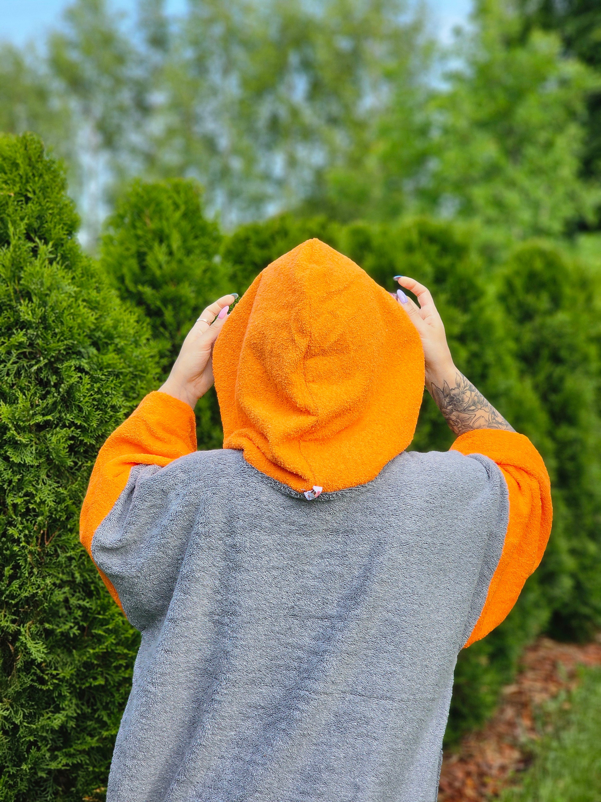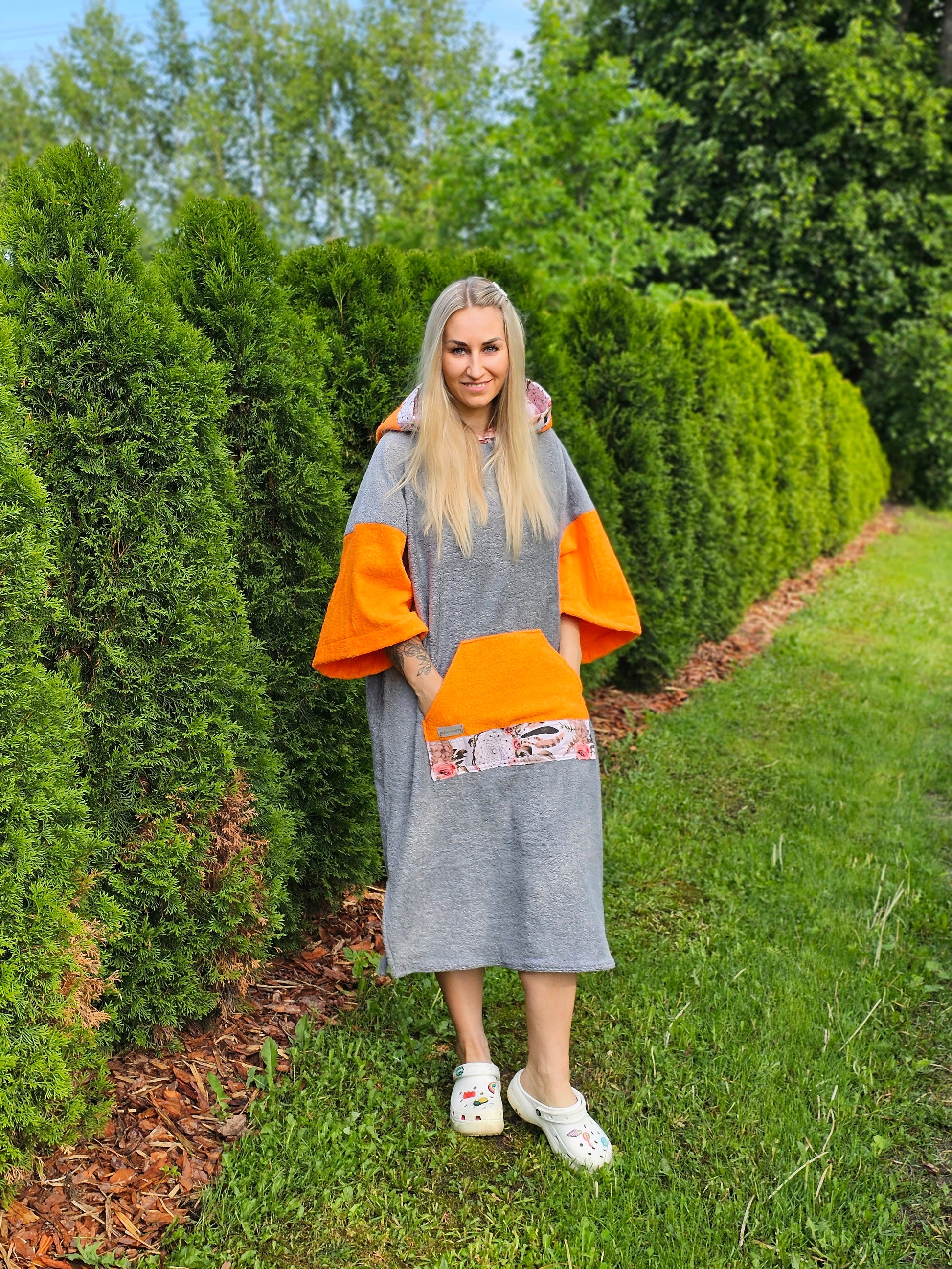Pončo ar lielu kapuci, 1 kabatu priekšā un pagarinātām piedurknēm. Aizmugurē ir cilpiņa, lai var ērti pakārt.
