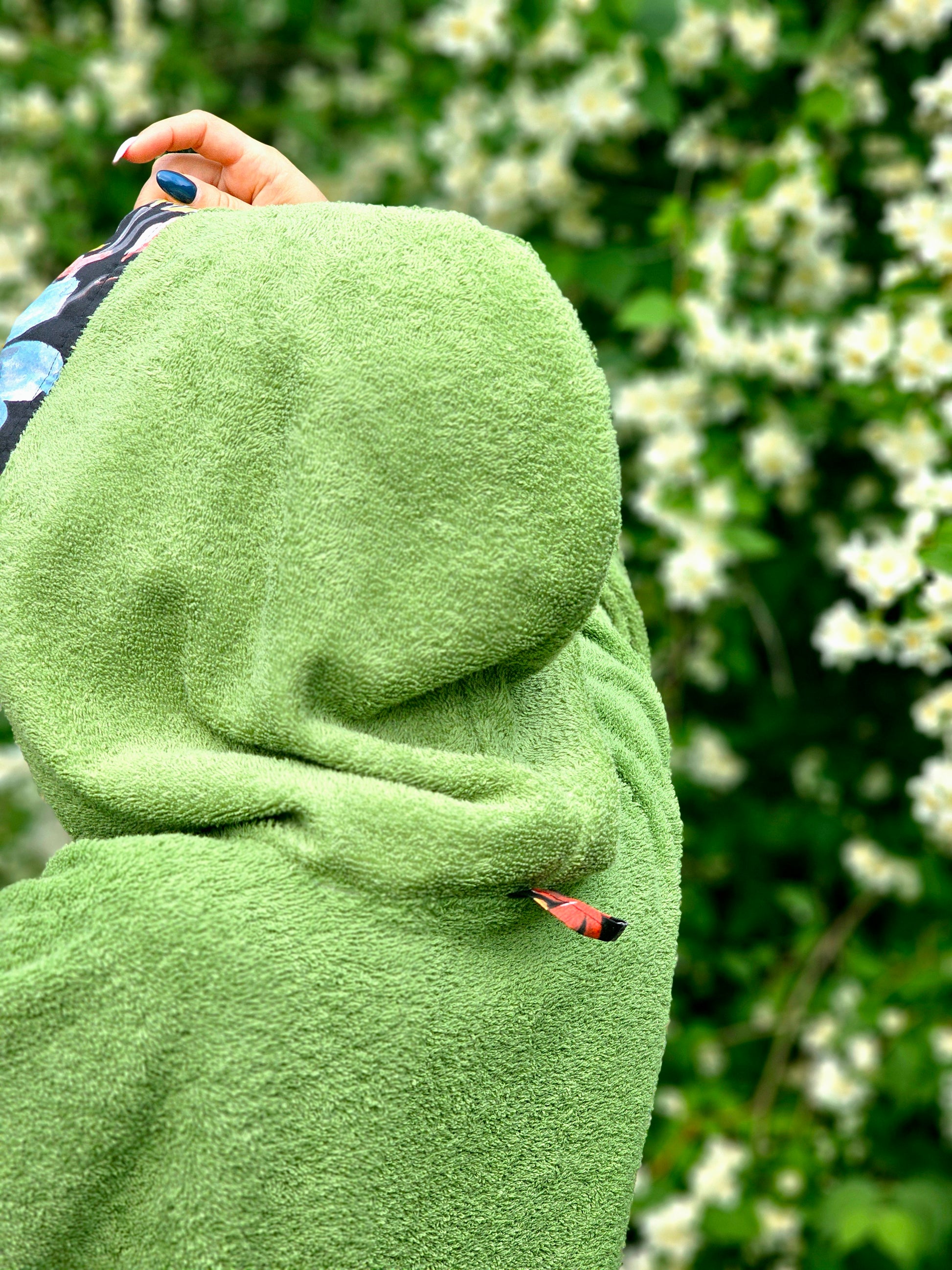 Pončo ar lielu kapuci, 1 kabatu priekšā un pagarinātām piedurknēm. Aizmugurē ir cilpiņa, lai var ērti pakārt.