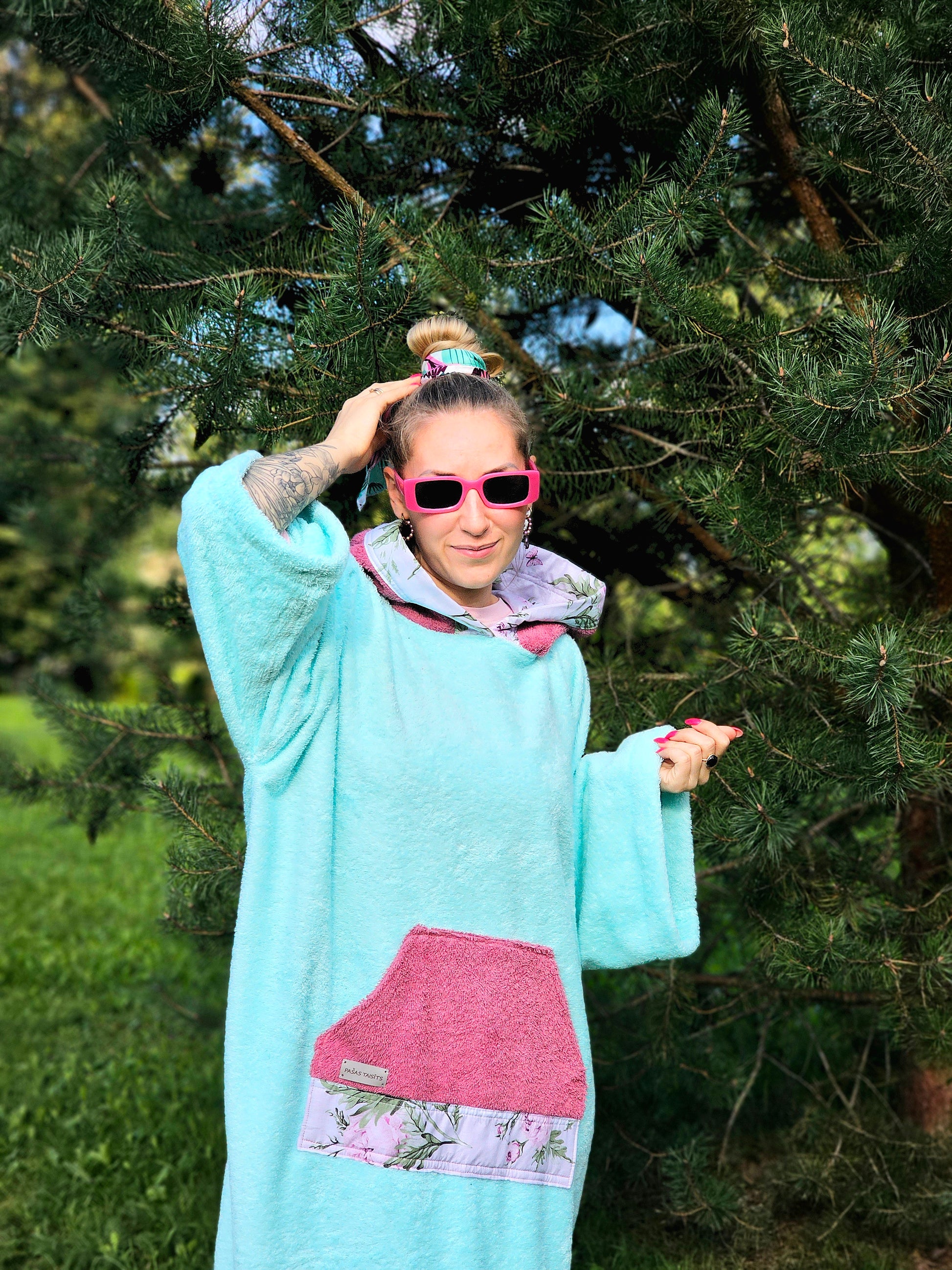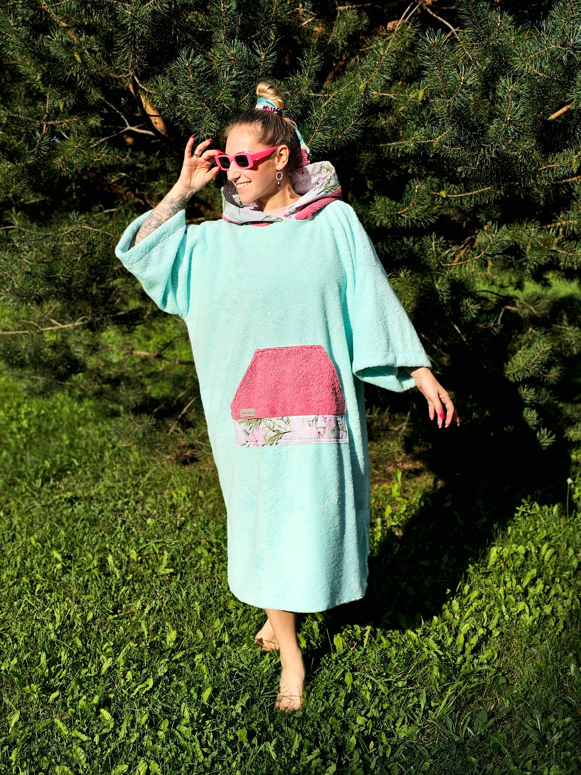 Pončo ar lielu kapuci,1 kabatu priekšā un pagarinātām piedurknēm. Aizmugurē ir cilpiņa, lai var ērti pakārt.