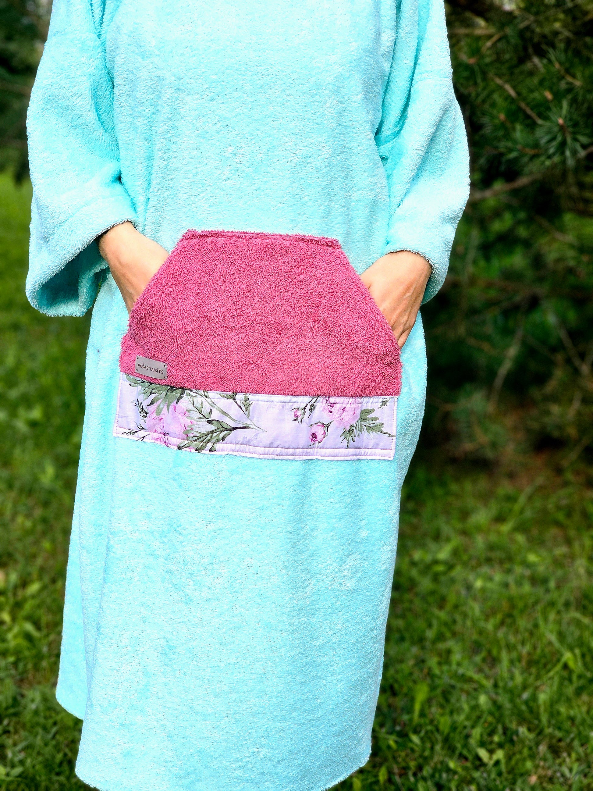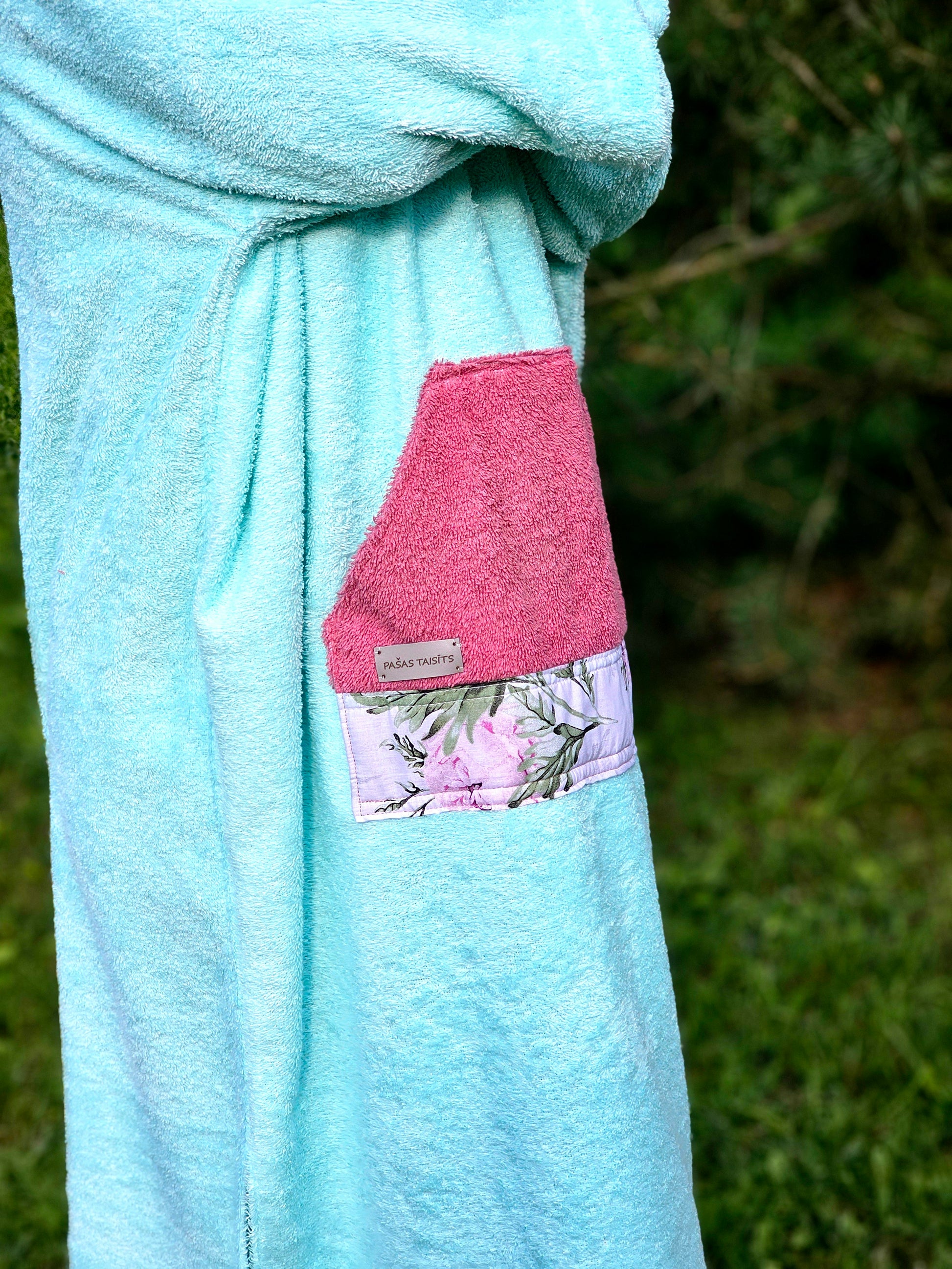 Frotē halāts ar lielu, ērtu kapuci, vienu lielu vai divām kabatām priekšpusē noderēs lietošanai pirtī, mājās, spa, kublā. Lieliska dāvana kā pirts baudītājiem, tā ūdenssporta cienītājiem. 100% kokvilnas audums. Labi uzsūc mitrumu. Iespējams izvēlēties sev tīkamus toņus, ar vai bez rāvējslēdzēja, slīpās vai taisnās kabatas. Varam iešūt vārdu, tekstu vai kādu zīmējumu. Gan lieliem, gan maziem vai burvīgs ģimenes komplekts ar saskaņotām detaļām. Mazgāt veļas mašīnā 40 °C temperatūrā.