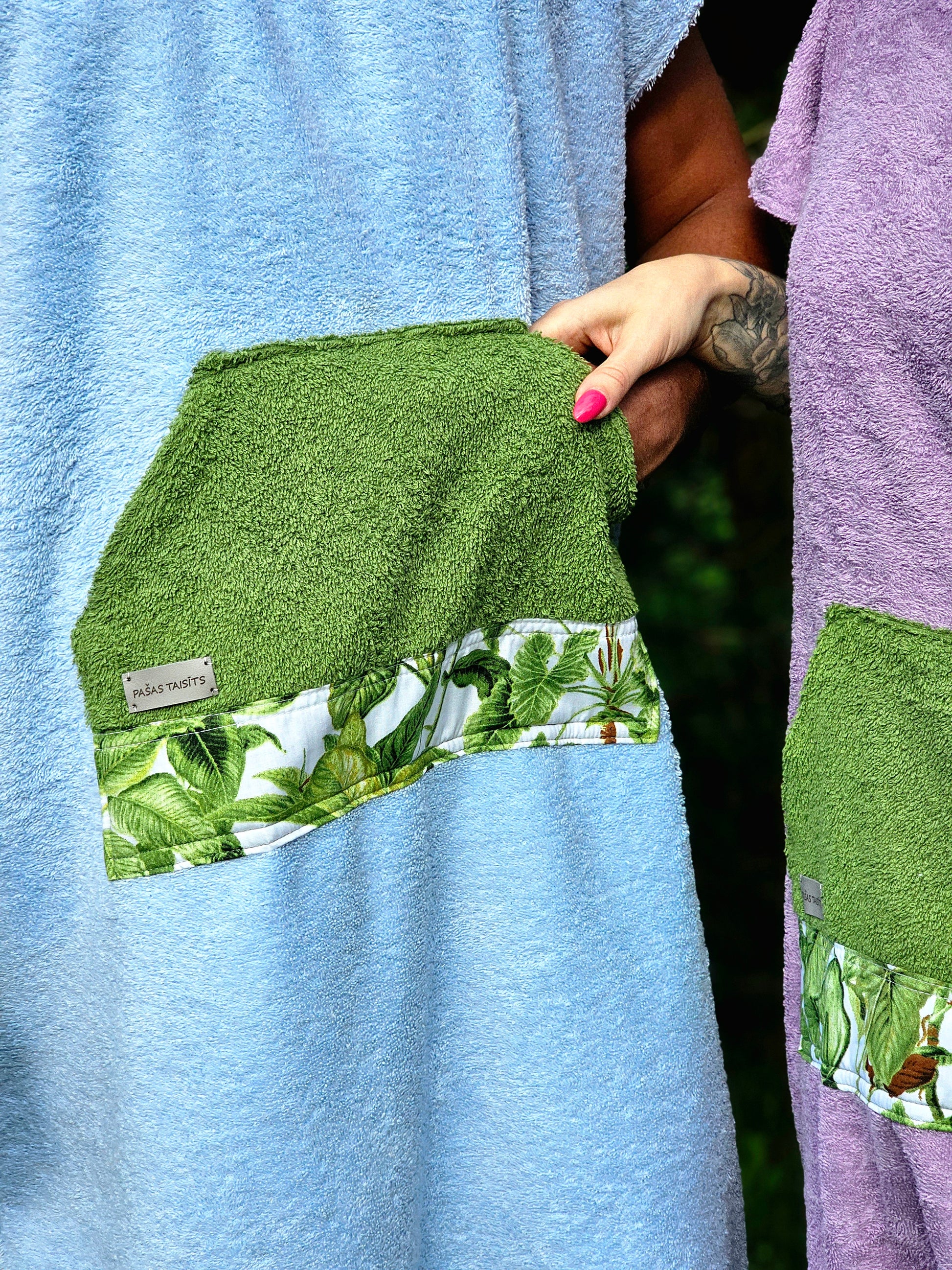 Frotē halāts ar lielu, ērtu kapuci, vienu lielu vai divām kabatām priekšpusē noderēs lietošanai pirtī, mājās, spa, kublā. Lieliska dāvana kā pirts baudītājiem, tā ūdenssporta cienītājiem. 100% kokvilnas audums. Labi uzsūc mitrumu. Iespējams izvēlēties sev tīkamus toņus, ar vai bez rāvējslēdzēja, slīpās vai taisnās kabatas. Varam iešūt vārdu, tekstu vai kādu zīmējumu. Gan lieliem, gan maziem vai burvīgs ģimenes komplekts ar saskaņotām detaļām. Mazgāt veļas mašīnā 40 °C temperatūrā.